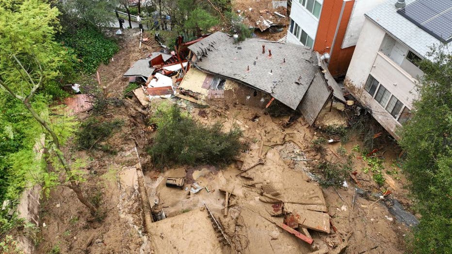 The ruins of a house that was abruptly destroyed by a landslide are seen as a historic atmospheric river storm inundates the Hollywood Hills area of Los Angeles, California, on February 6, 2024. (Photo by DAVID MCNEW/AFP via Getty Images)