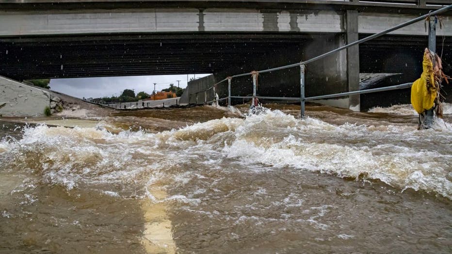 Ballona Creek with very high water levels during Atmospheric river hoits Los Angeles, Feb 5, 2024. (Photo by: Citizen of the Planet/Universal Images Group via Getty Images)