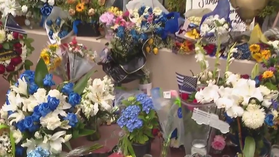The Baldwin Park community is mourning the loss of Officer Samuel Riveros, 35, a nine-year veteran of the department, and Darius Wong, 43, a father of two. A growing memorial outside the Baldwin Park Police Department honors their memory, with tributes including flowers, notes, and memorabilia.