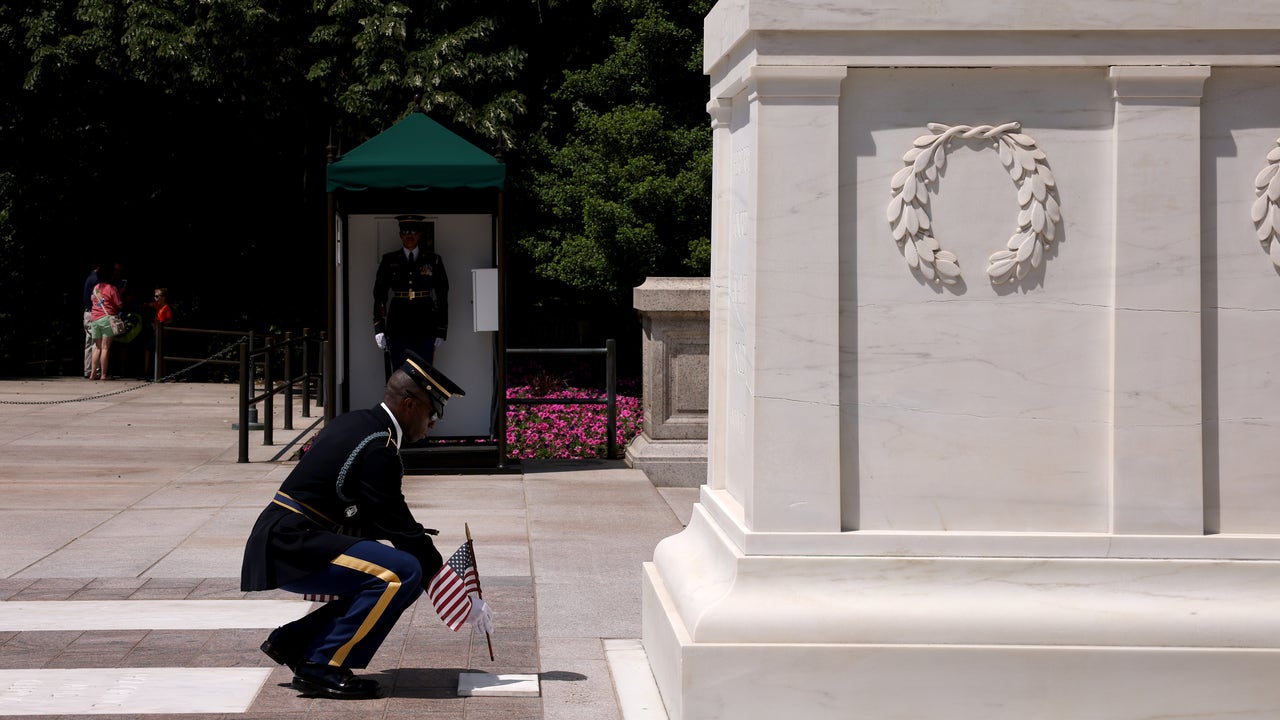 A service member places a flag at the Tomb of the Unknown Soldier as part of the "Flags In" ceremony ahead of the Memorial Day weekend at Arlington National Cemetery on May 27, 2021 in Arlington, Virginia. For the first time in 20 years, members from