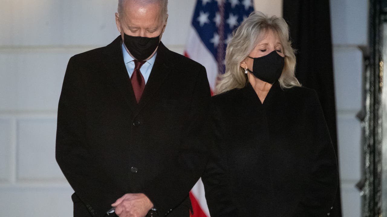 Biden, first lady Jill Biden, Vice President Kamala Harris and second gentleman Doug Emhoff stood outside the White House for a moment of silence while the National Cathedral tolled its bell 500 times for each 1,000 lives lost.