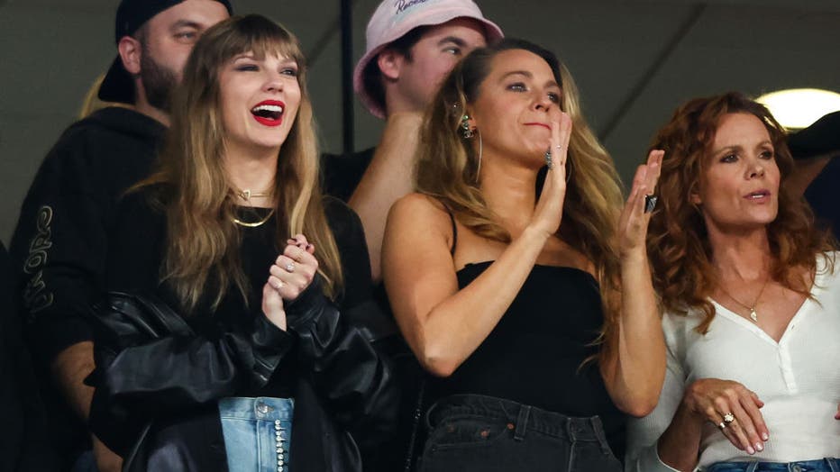 Taylor Swift and Blake Lively cheer from the stands during an NFL football game between the New York Jets and the Kansas City Chiefs at MetLife Stadium on October 1, 2023 in East Rutherford, New Jersey. (Photo by Kevin Sabitus/Getty Images)