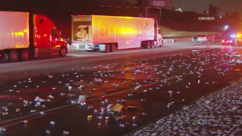 Officials said the SigAlert was issued following a crash involving five cars and three big rigs, causing thousands of spilled beer cans and metal kegs to spill onto the roadway. One of the big rigs split in half and some cars were hit by debris after the collision.