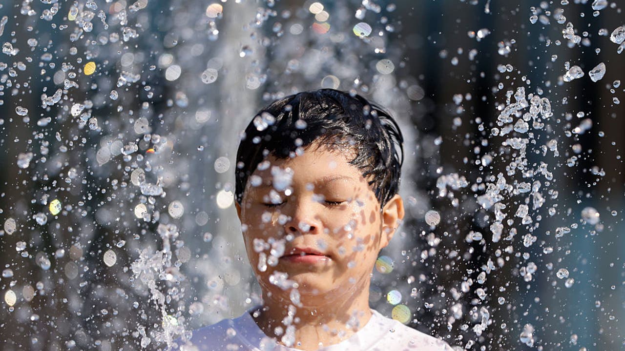 Jordan Casillas, 9, cools off at the water park at Lincoln Park on Tuesday, Aug. 5, 2025 in Los Angeles, CA. (Carlin Stiehl / Los Angeles Times via Getty Images)
