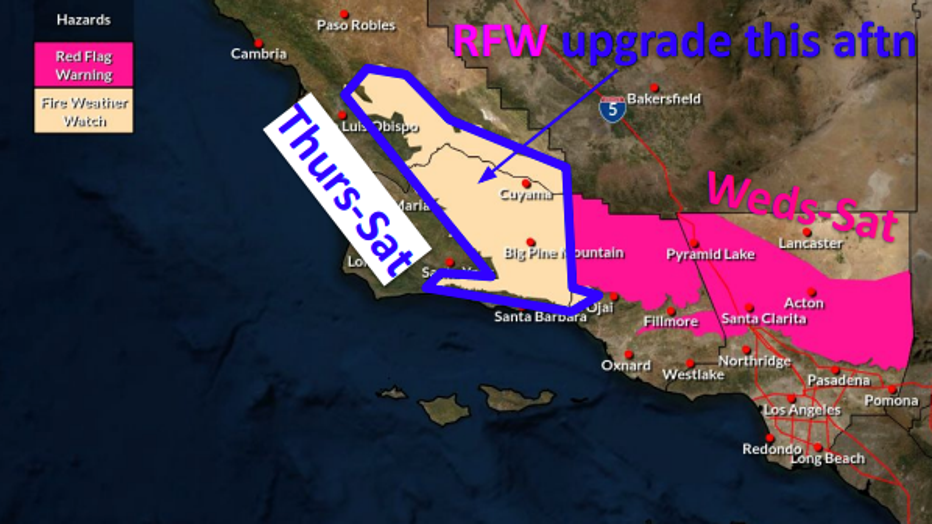 A Red Flag Warning is in effect from 9 a.m. Wednesday to 9 p.m. Saturday due to the "unseasonably hot and unstable air mass capable of producing extreme fire behavior," the NWS said. The warning applies to the Santa Clarita Valley, San Gabriel Mountains, Antelope Valley foothills, and the 5 and 14 freeway corridors. Those are the areas expected to face "unseasonably hot, high temperatures, generally 95 to 110 degrees," combined with humidity levels as low as 8%, according to the NWS.