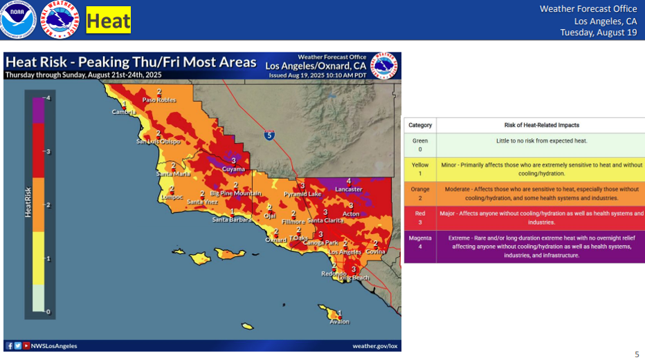 An Extreme Heat Warning is in effect from 11 a.m. Thursday to 9 p.m. Saturday in the Santa Clarita Valley, western Santa Monica Mountains, Calabasas, Agoura Hills, the San Fernando Valley, San Gabriel Mountains, the Antelope Valley and foothills, the San Gabriel Valley and the 5 and 14 freeway corridors.