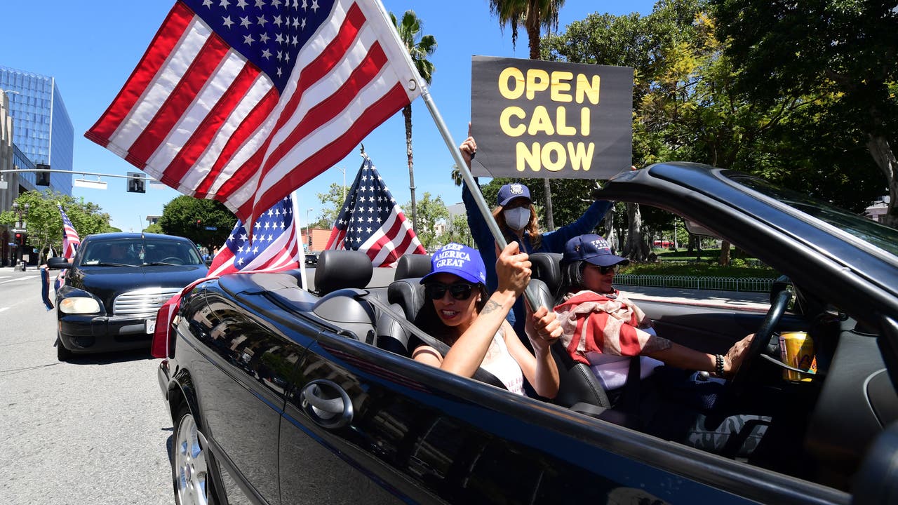 In Los Angeles there was a drive-through protest near City Hall, with people in cars honking horns and waving signs reading “Open Cali Now” and “Freedom is Contagious.”