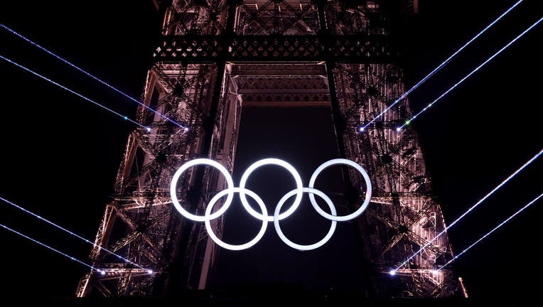 A Light Show takes place as The Olympic Rings on the Eiffel Tower are illuminated during the opening ceremony of the Olympic Games Paris 2024 at Place du Trocadero on July 26, 2024 in Paris, France. (Photo by Hector Vivas/Getty Images)