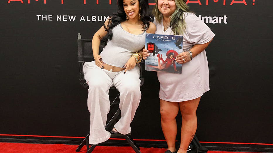 HOUSTON, TEXAS - SEPTEMBER 23: Cardi B poses with a fan at the Cardi B "Am I The Drama" meet and greet at Walmart on September 23, 2025 in Houston, Texas. (Photo by Thaddaeus McAdams/Getty Images)