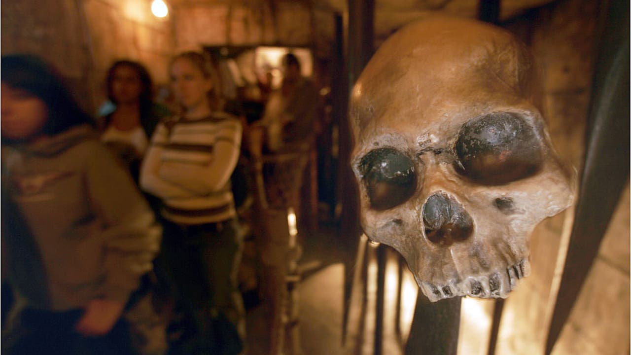 People waiting in line to get on the Indiana Jones attraction at Disneyland make their way through the spike chamber. (Photo by Don Kelsen/Los Angeles Times via Getty Images)