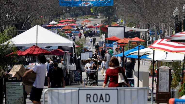 Main Street in downtown Ventura is closed to vehicle traffic so restaurants can set up outdoor dining areas. Photographed in Ventura on Wednesday, October 7, 2020. (Myung J. Chun / Los Angeles Times via Getty Images)