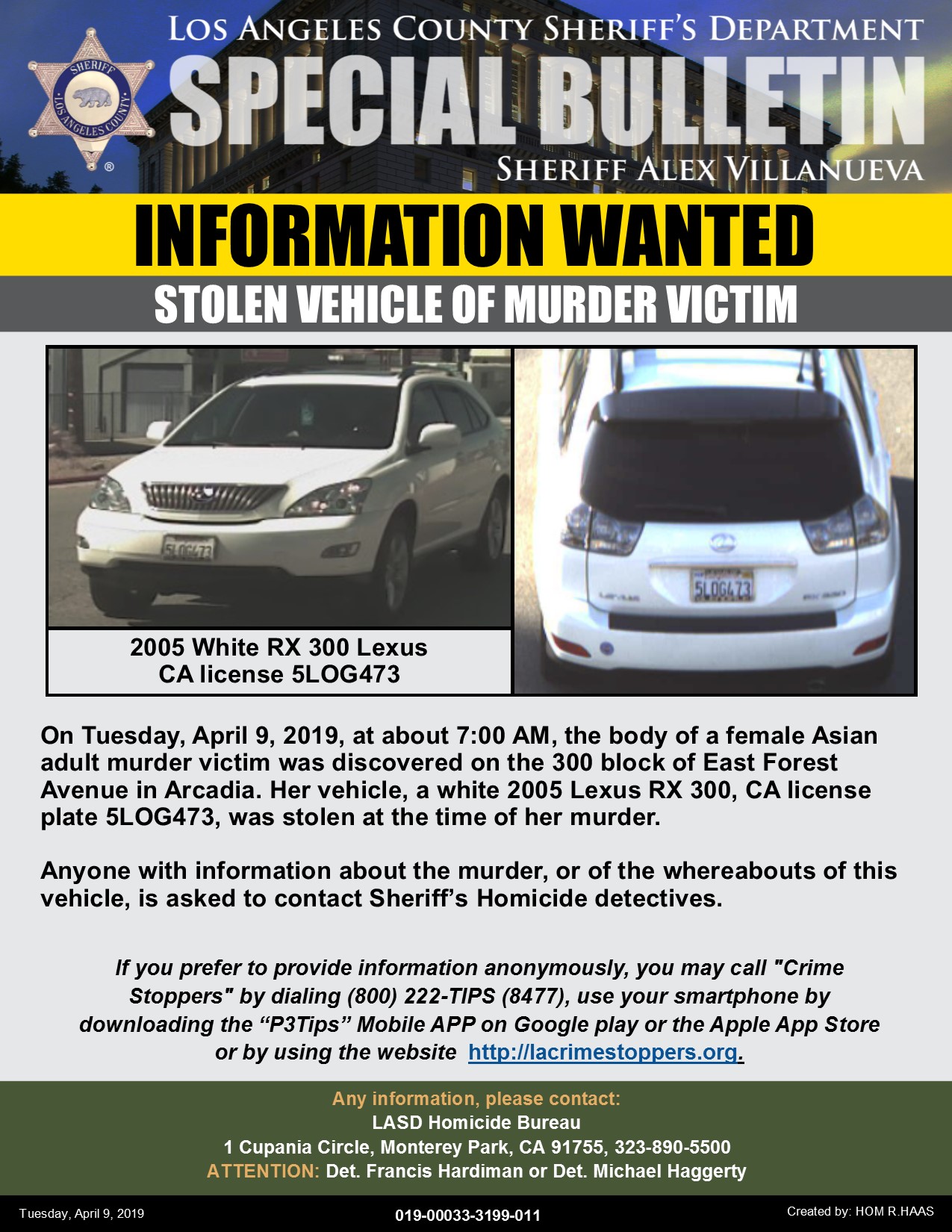 Anyone with information about the woman's death or her vehicle was asked to call the Los Angeles County Sheriff's Department Homicide Bureau at 323-890-5500. You can also remain anonymous by calling Crime Stoppers at 800-222-TIPS (8477).