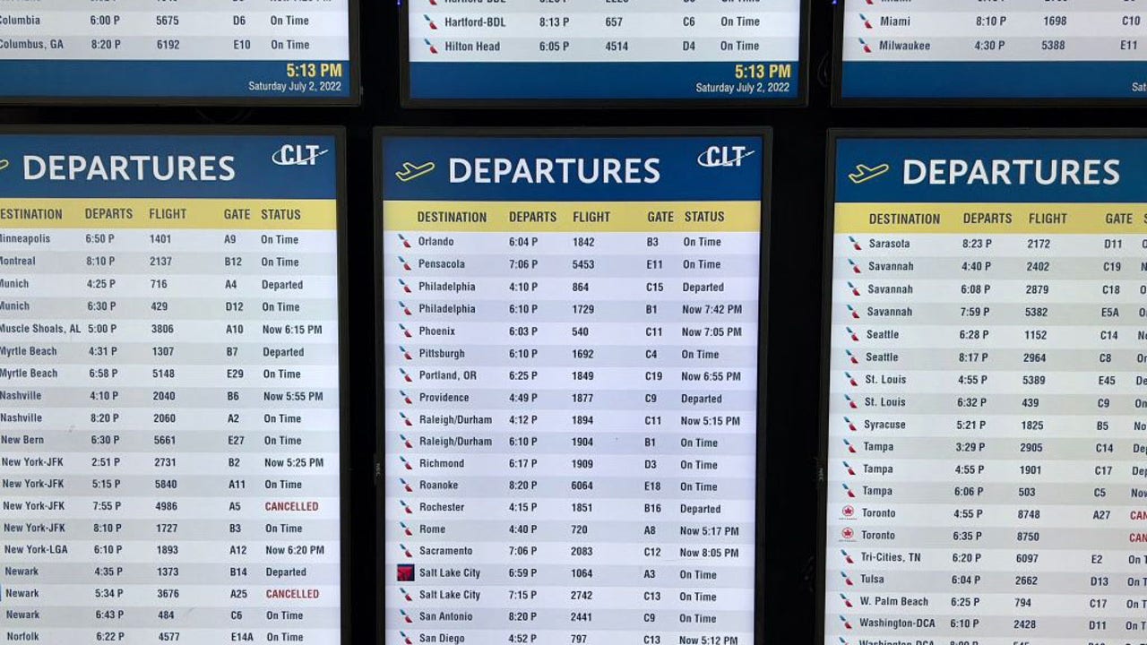Screens display flight departure schedules at Charlotte Douglas International Airport (CLT) in Charlotte, North Carolina, on July 2, 2022. (Photo by Daniel Slim / AFP via Getty Images)
