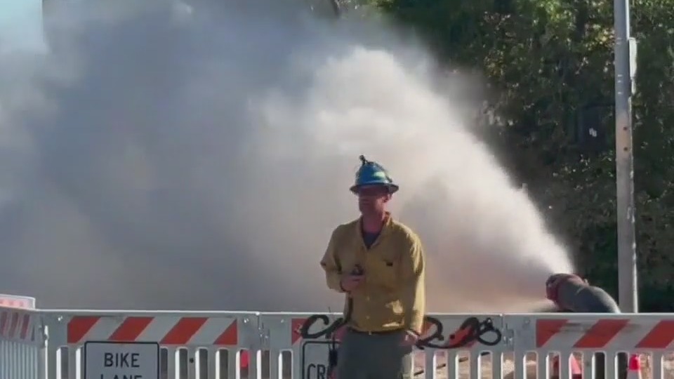 According to the Los Angeles Department of Water and Power, there was a temporary connection at the pipe at the intersection when a pressure spike caused the connector to disconnect. Officials said crews were planning ot drain the pipe at 8 p.m. to prepare to cut it on Sunday. Water to the pipe was also shut off.