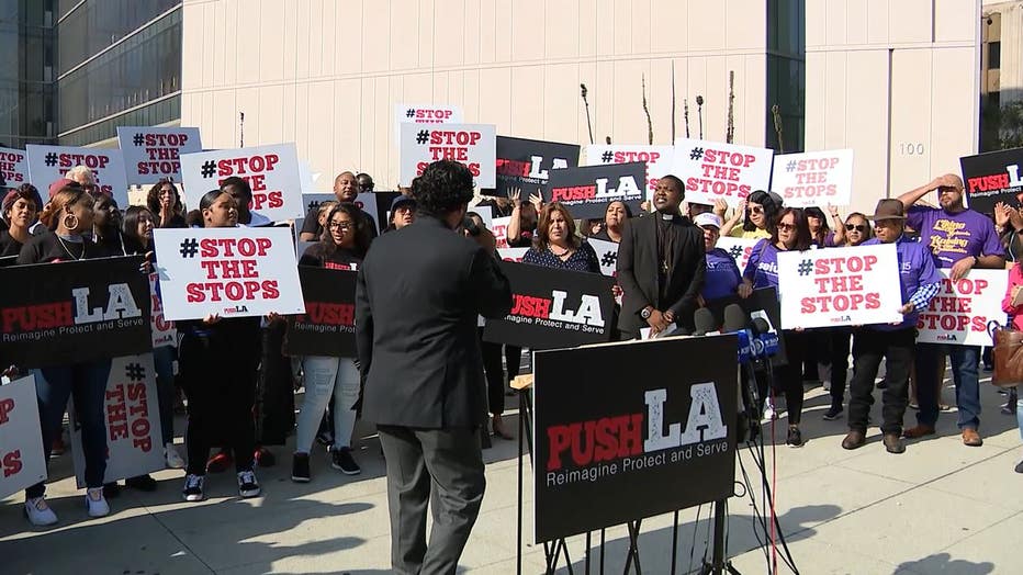 Members of the PUSH L.A. Coalition and other organizations said they were sending letters to LAPD Chief Michel Moore and Mayor Eric Garcetti demanding changes in traffic-stop policies and calling for a formal apology from the chief and acknowledgement that racial profiling exists within the department.