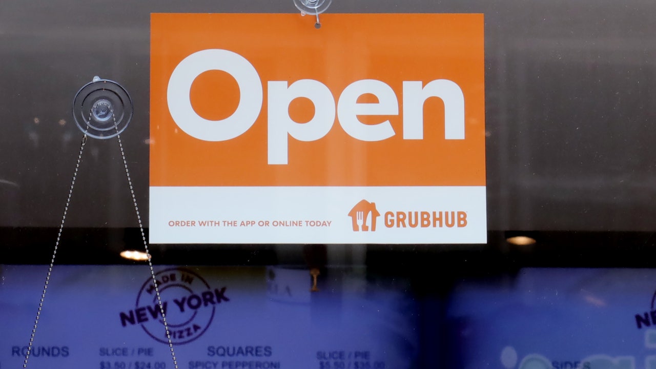 A Grubhub sign is displayed on a store front on July 07, 2023 in New York City. (Photo by Leonardo Munoz/VIEWpress)