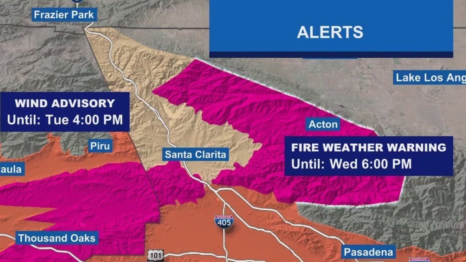 The National Weather Service issued a red flag warning from 6 a.m. Tuesday to 6 p.m. Wednesday for the southeastern Ventura County valleys, the Santa Susana Mountains, and areas along the Highway 14 corridor.