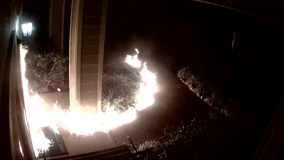 Video surveillance footage captured the suspect pouring a liquid on the outside of the building on El Toro Road and then setting fire to it in the early morning hours on Tuesday, according to the Orange County Fire Authority.