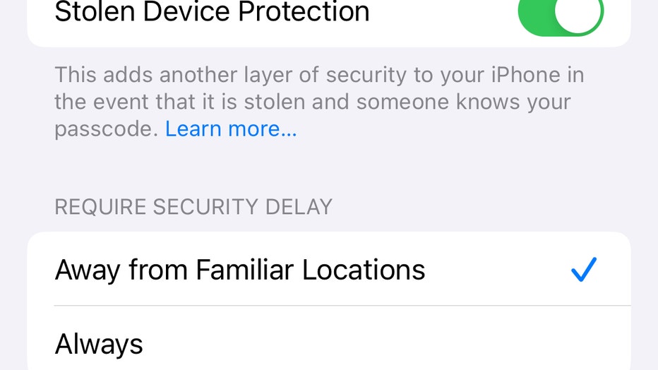 After you open Stolen Device Protection and turn it on, under you’ll see two options to choose from in requiring a security delay: "away from familiar locations" or "always." Select "always" if you want to add them at all locations.