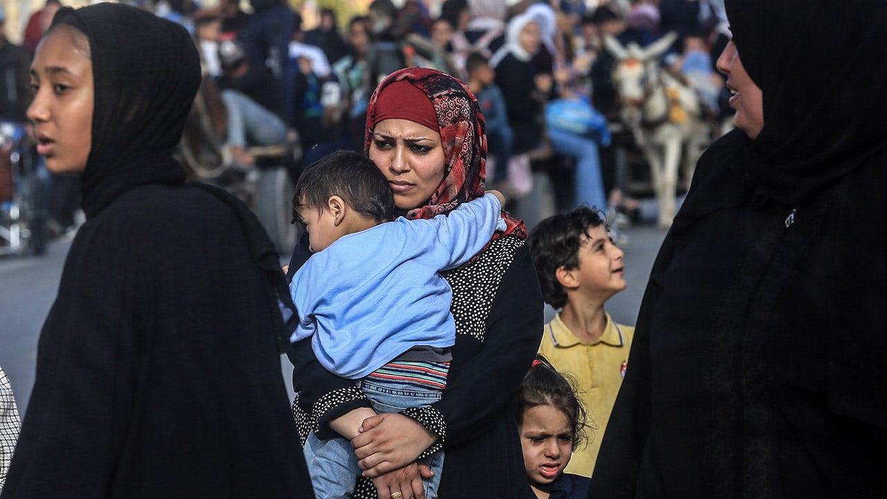 Palestinians fleeing Gaza City and other parts of the northern Gaza Strip through Salah al-Din Street arrive in the Bureij Palestinian refugee camp in the central Gaza Strip on Nov. 8, 2023. (Photo by Mohammed Talatene/picture alliance via Getty Imag