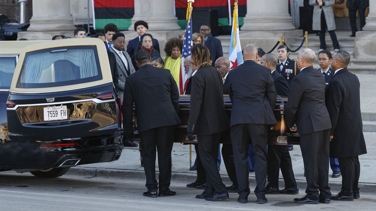 On Thursday, family members wiped away tears as the casket was brought into the stately brick building. Flowers lined the sidewalks where people waiting to enter watched a large video screen playing excerpts of Jackson's notable speeches. Inside, Jackson's children, Chicago Mayor Brandon Johnson and the Rev. Al Sharpton were among those who stood by the open casket to shake hands and hug those coming to view the body of Jackson, dressed in a suit and blue shirt and tie.