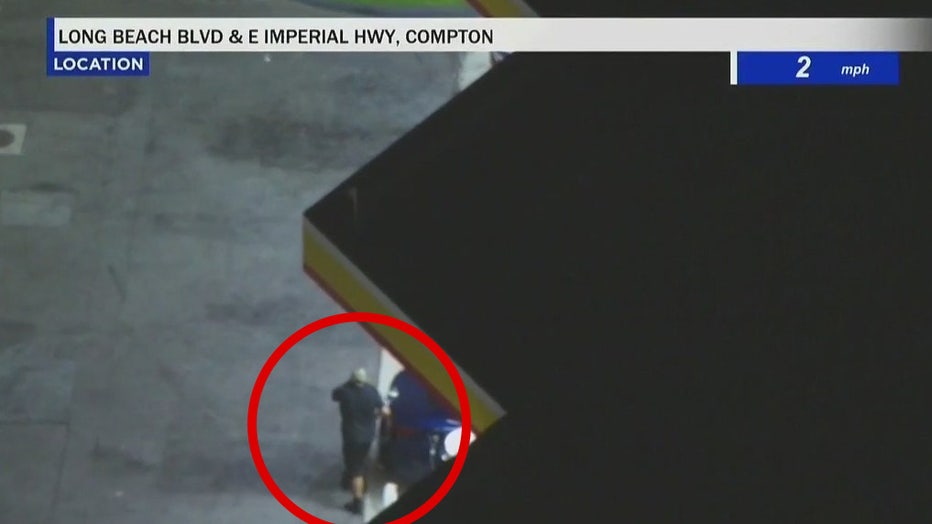 10:50 p.m.: The driver's stint on the 105 Freeway did not last long, before the driver went back into Compton, and again, pulled into a gas station. This time however, the driver got out and fueled up, seeming to cover their face while they did. Without officers chasing, however, SkyFOX abandoned the pursuit.