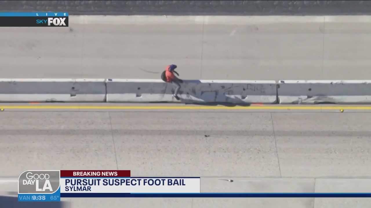 SkyFOX flew over the scene and showed the suspect running across lanes on the 210 Freeway in the Sylmar area. It's a dangerous stunt he did twice while evading officers.