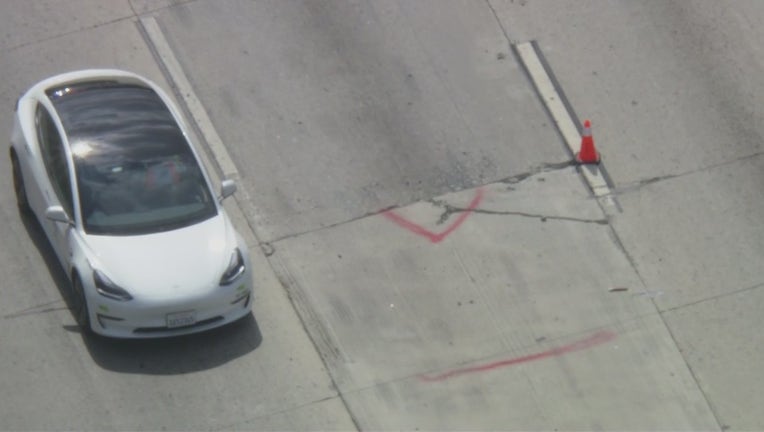 The crack was found around 7:40 a.m. by crews that responded to a crash of a car into debris on the freeway, according to the California Highway Patrol.