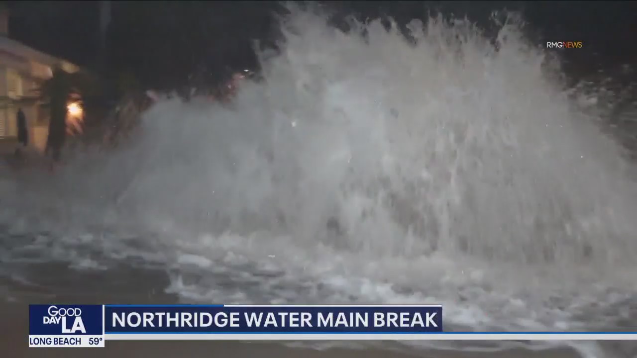 NORTHRIDGE, Calif. - Part of a home is damaged after a large water main break erupted in Northridge overnight.