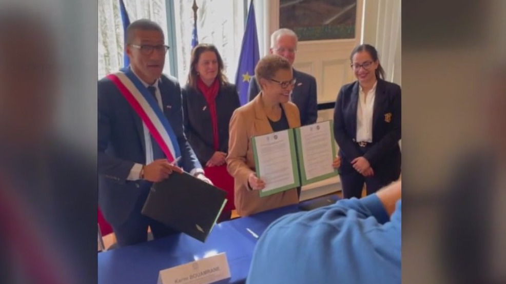 Bass, who is leading a delegation of city officials in Paris this weekend, signed and agreement with Saint-Ouen-sur-Seine Mayor Karim Bouamrane ahead of the Paris Olympic and Paralympic Games "to formalize collaborating on our shared priorities for youth, the environment, sports, and culture and to share knowledge from the 2024 Games in Paris in order to adequately prepare," according to a statement from the Mayor's Office.