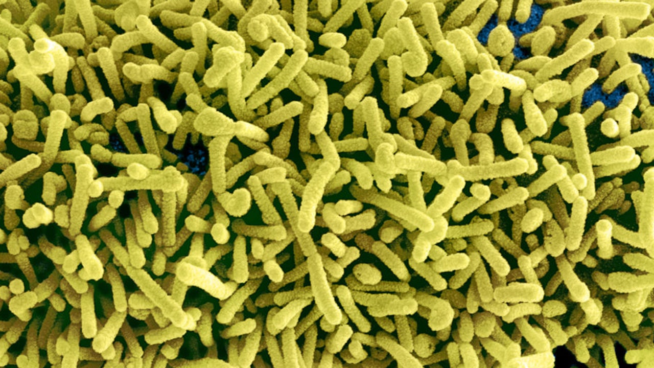 FILE - Colorized scanning electron micrograph of Marburg virus particles (yellow) both budding and attached to the surface of infected VERO E6 cells (blue). (IMAGE POINT FR/NIH/NIAID/BSIP/Universal Images Group via Getty Images)