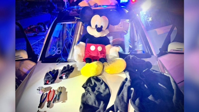 Once they pulled over, officers found several items in the suspects’ SUV, including burglary tools, meth pips, and the Mickey Mouse stuffed animal that was taken from the dental office.