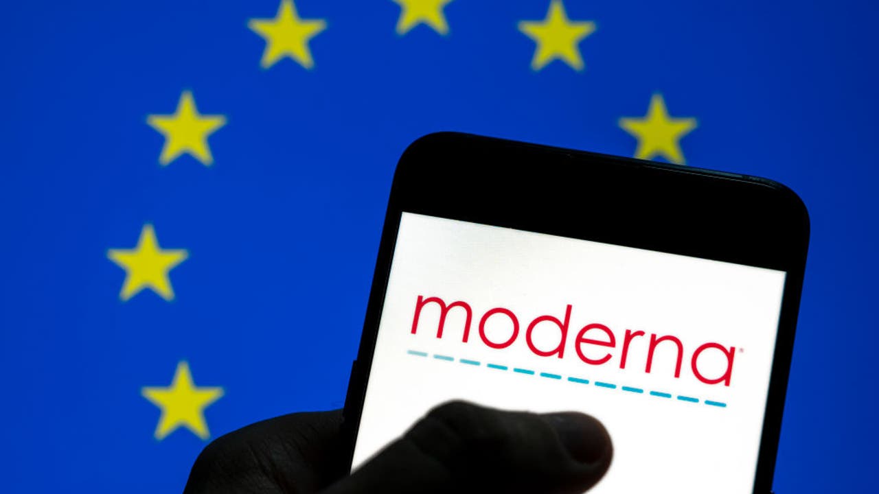 In this photo illustration the American pharmaceutical and biotechnology company Moderna logo is seen on an Android mobile device screen with the European Union (EU) flag in the background. (Photo Illustration by Chukrut Budrul/SOPA Images/LightRocke