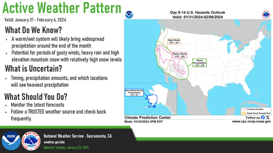 Between Jan. 31 and Feb. 5, NWS said there is a high risk — greater than 60% chance — of "hazardous" and "heavy" precipitation forecast across California. This could lead to localized flooding, particularly in areas that have already been hit with heavy rain.