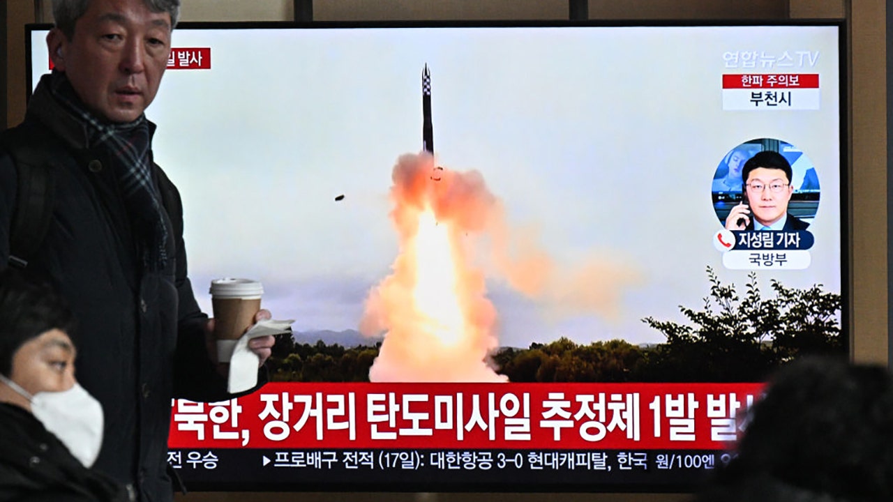 A man walks past a television screen showing a news broadcast with file footage of a North Korean missile test, at a railway station in Seoul on Dec. 18, 2023. (Photo by ANTHONY WALLACE/AFP via Getty Images)