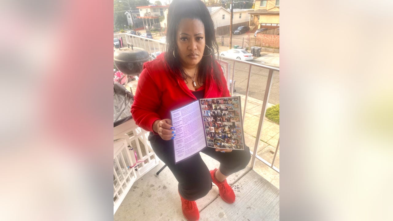 Elvira Monk of Oakland holds a picture of her brother's funeral brochure. He died at Santa Rita Jail in November 2021 Photo: Lisa Fernandez
