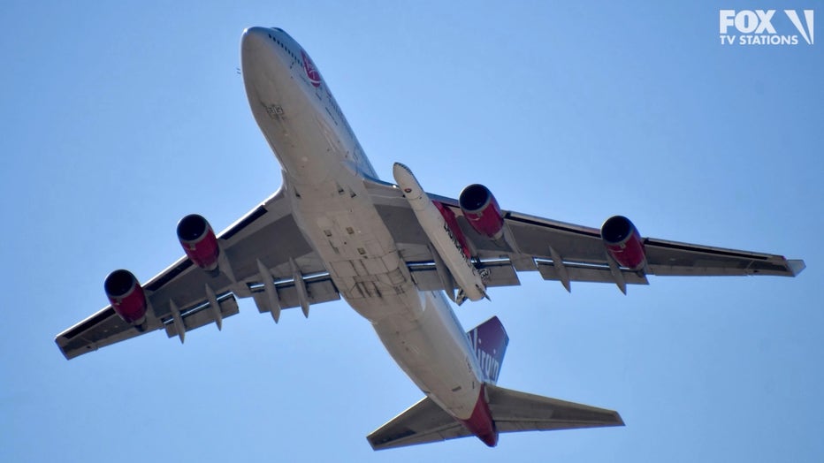Virgin's Orbit Girl 747 takes off with the LauncherOne rocket fully loaded for a dress rehearsal test flight Sunday, April 12, 2020.