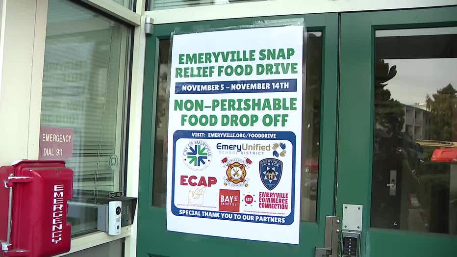 Emeryville SNAP Relief Food Drive sign in Emeryville. Nov. 7, 2025