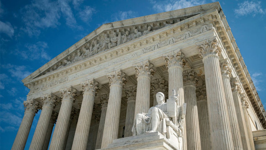 FILE - The Guardian or Authority of Law, created by sculptor James Earle Fraser, rests on the side of the U.S. Supreme Court on Sept. 28, 2020 in Washington, DC. (Al Drago/Getty Images)
