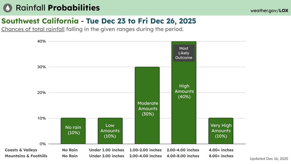 LOS ANGELES - After a period of unseasonably warm temperatures across Southern California, the region is bracing for a major weather shift as a series of storms fueled by an atmospheric river is expected to deliver widespread rain and heavy high-elevation snow just in time for the Christmas holiday.