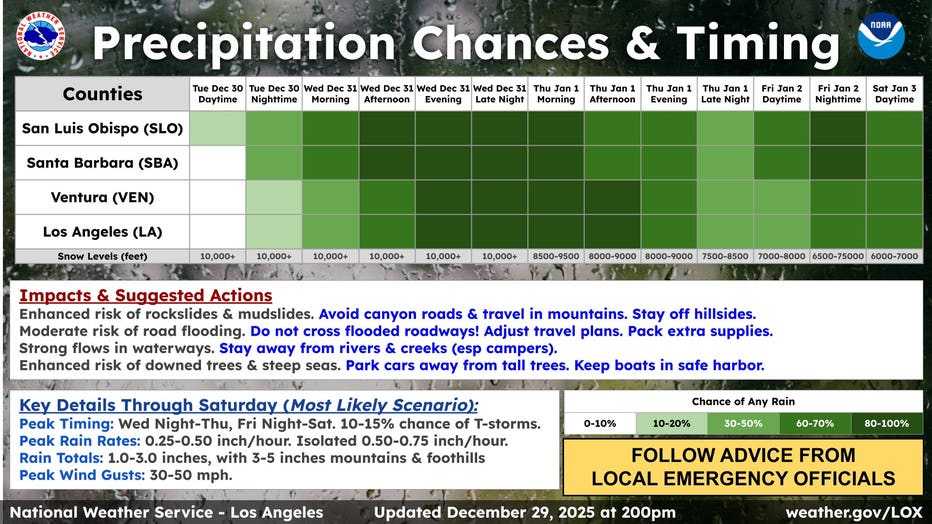 Additionally, spectators and participants in the Rose Parade should expect "periods of light to moderate rain" and should plan accordingly to stay dry.