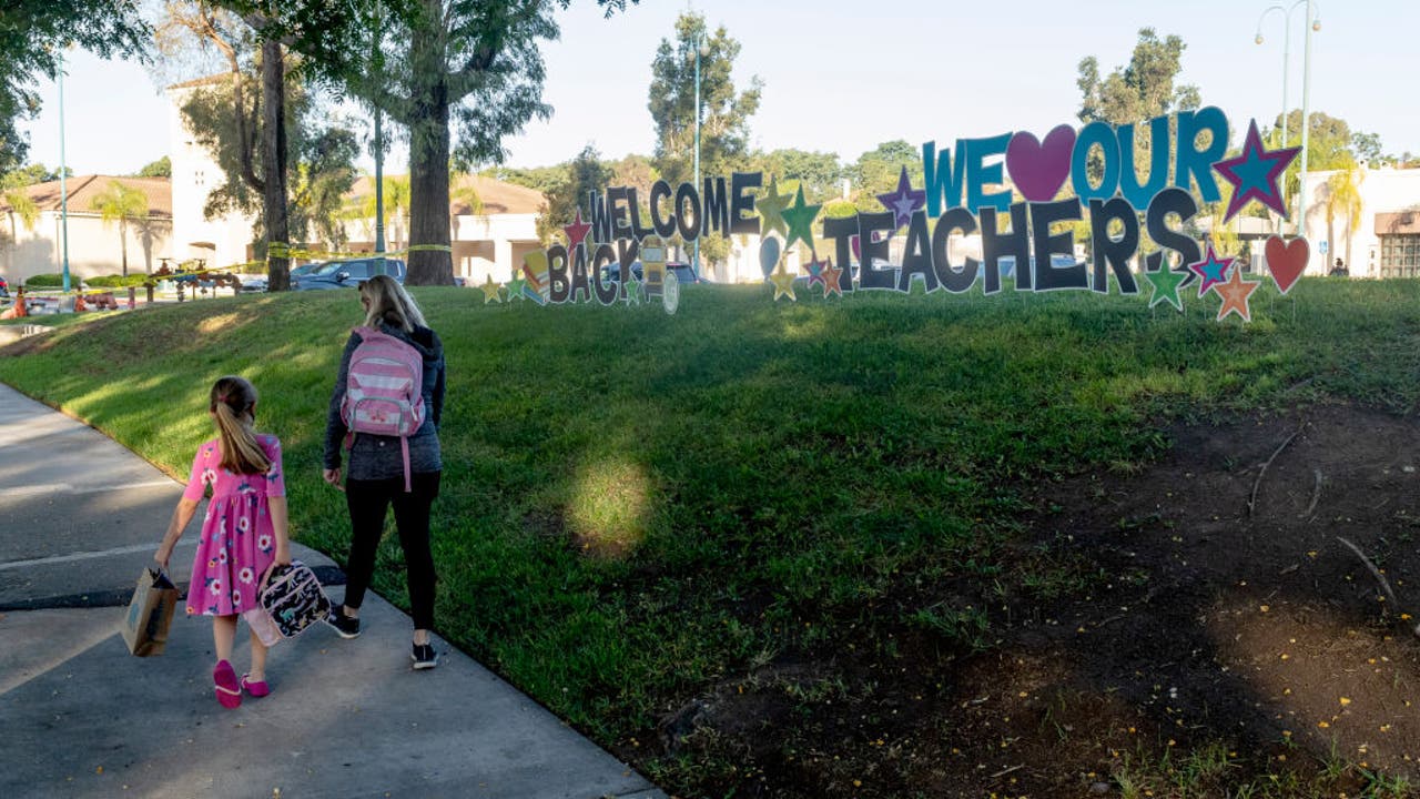 FILE - Students head to school past a welcome back sign on the first day of in-person instruction at Arroyo Vista Elementary School on Sept. 29, 2020 in Rancho Santa Margarita, California. (Photo by Paul Bersebach/MediaNews Group/Orange County Regist
