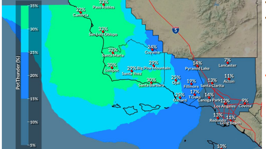 There is a 10-20% chance of thunderstorms from Monday night through Tuesday, primarily over the northern coastal waters and in San Luis Obispo and Santa Barbara counties.