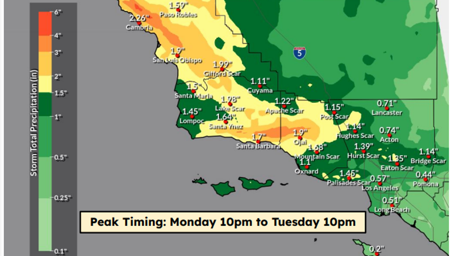Rainfall totals are expected to be highest for San Luis Obispo and Santa Barbara Counties, as well as the Ventura County mountains, with totals ranging from 1.5 to 2.5 inches.