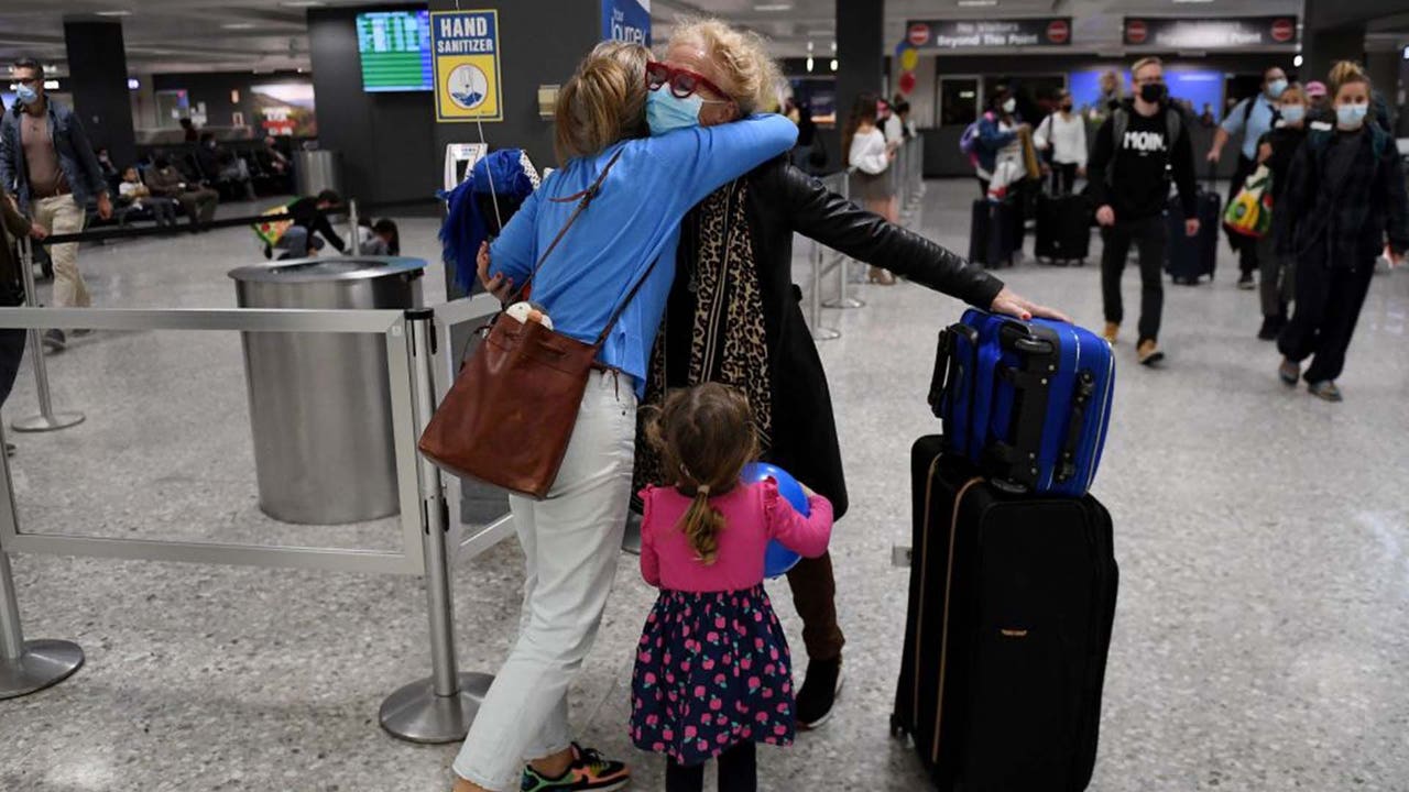FILE - Daughter embraces mother at the airport after COVID-19 travel restrictions eased.