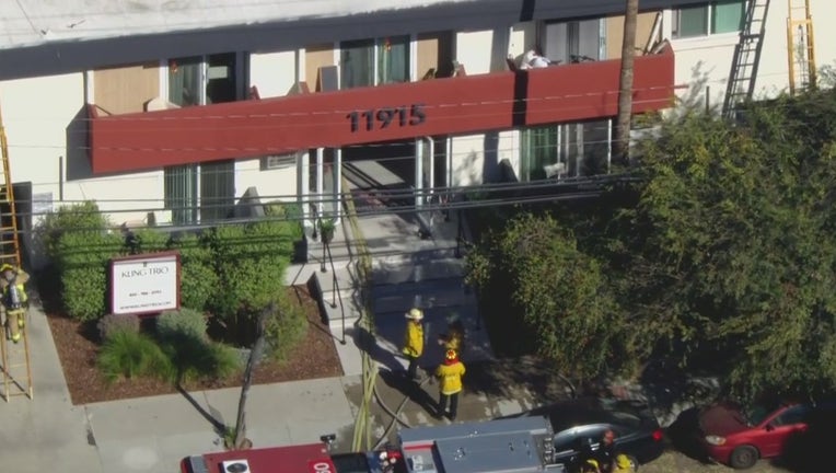 Officials with the Los Angeles Fire Department said the fire broke out just before 10:30 a.m. at the two-story, garden-style apartment building located at 11915 W. Kling St. in Valley Village, located near the intersection of Riverside Drive and Radford Avenue.