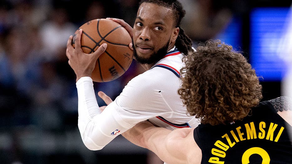 Inglewood, CA - April 12: LA Clippers guard Darius Garland (10) looks to pass against Golden State Warriors guard Brandin Podziemski (2) during the first half of an NBA basketball game at Intuit Dome on Sunday, April 12, 2026 in Inglewood, CA. (Eric (Getty Images)