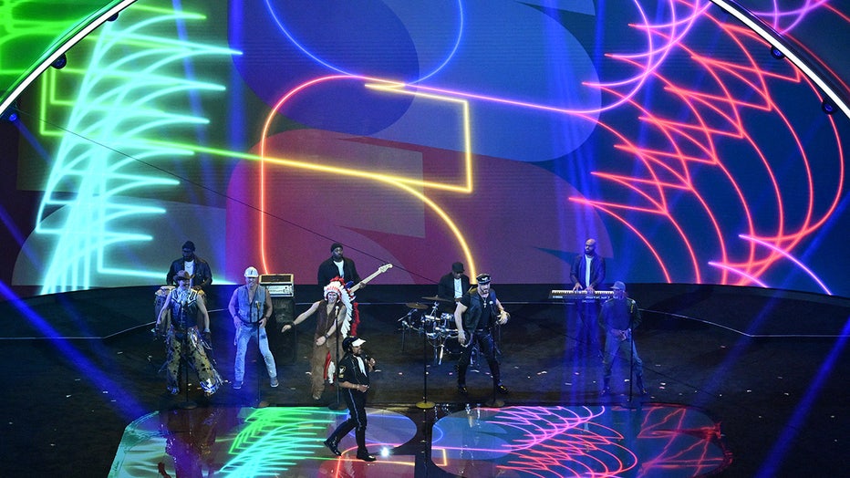Musical Group The Village People perform the song "YMCA" on stage during the draw for the 2026 FIFA Football World Cup taking place in the US, Canada and Mexico, at the Kennedy Center, in Washington, DC, on December 5, 2025. (Photo by Roberto SCHMIDT
