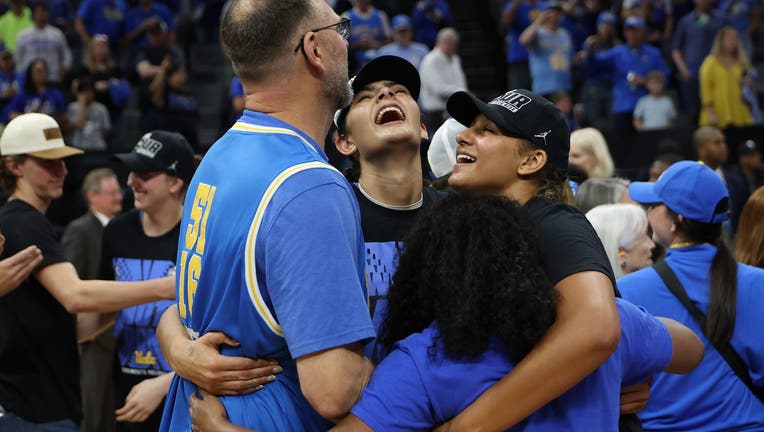 SACRAMENTO, CALIFORNIA - MARCH 29: Sienna Betts #16 and Lauren Betts #51 of the UCLA Bruins celebrates with their parents, Andy and Michelle Betts, after defeating the Duke Blue Devils 70-58 in the Elite Eight of the 2026 NCAA Women's Basketball Tour