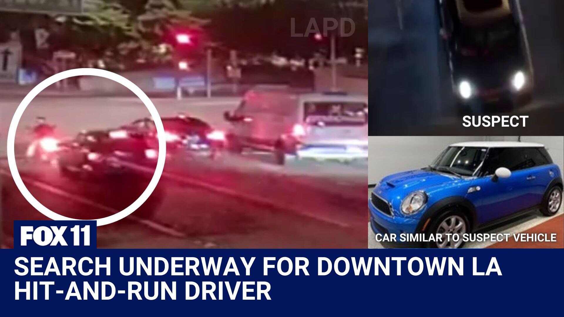 A search is underway for a Mini Cooper accused of running over a moped driver in Downtown Los Angeles and then driving off the crash scene.